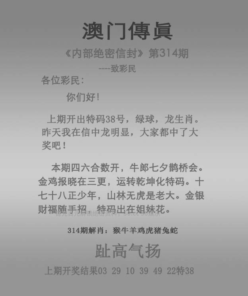 | 314期:独解传真 解:本期四六合数开,牛郎七夕鹊桥会。金鸡报晓在三更,运转乾坤化特码。十七十八正少年,山林无虎是老大。金银财福随手招,特码出在姐妹花。 送:猴牛羊鸡虎猪兔蛇 抓住一句解必中特 |